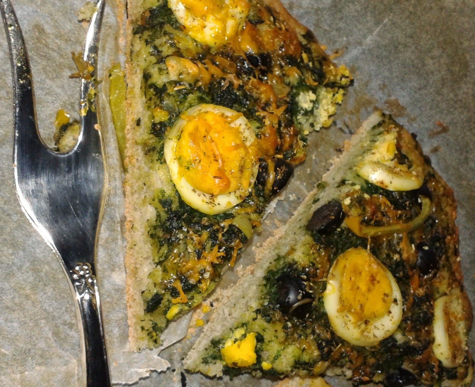 Podsmażony mrożony szpinak,na maśle czosnkowym, z cebulą i czosnkiem ,przestygnięty rozkładamy na spód pizzy.Następnie układamy plastry jajka,oliwki,pokrojone paski zielonej papryki. Na wierzch posypujemy pizzę startym ulubionym serem,suszonym oregano,doprawiamy curry.